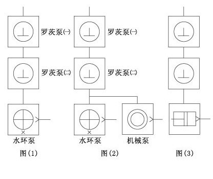 (3)如果三級羅茨水環(huán)機(jī)組還不能滿足極限壓力時,可采用羅茨泵-水環(huán)泵并聯(lián)機(jī)械真空泵;此機(jī)組主要用于需要處理大量水蒸汽,時間長且極限真空度要求非常高的抽真空系統(tǒng),例如在真空干燥方面。
